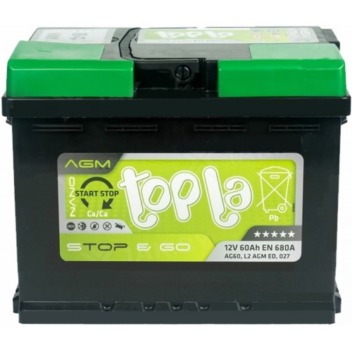 Topla 6СТ-60 R+ Top AGM Stop & Go — премиальный необслуживаемый аккумулятор, разработанный для автомобилей с системой Start-Stop. С емкостью 60 А·ч и пусковым током 680 А (EN), он обеспечивает надежный запуск двигателя при любых погодных условиях. Произведен в Словении, этот аккумулятор сочетает в себе европейское качество и надежность.